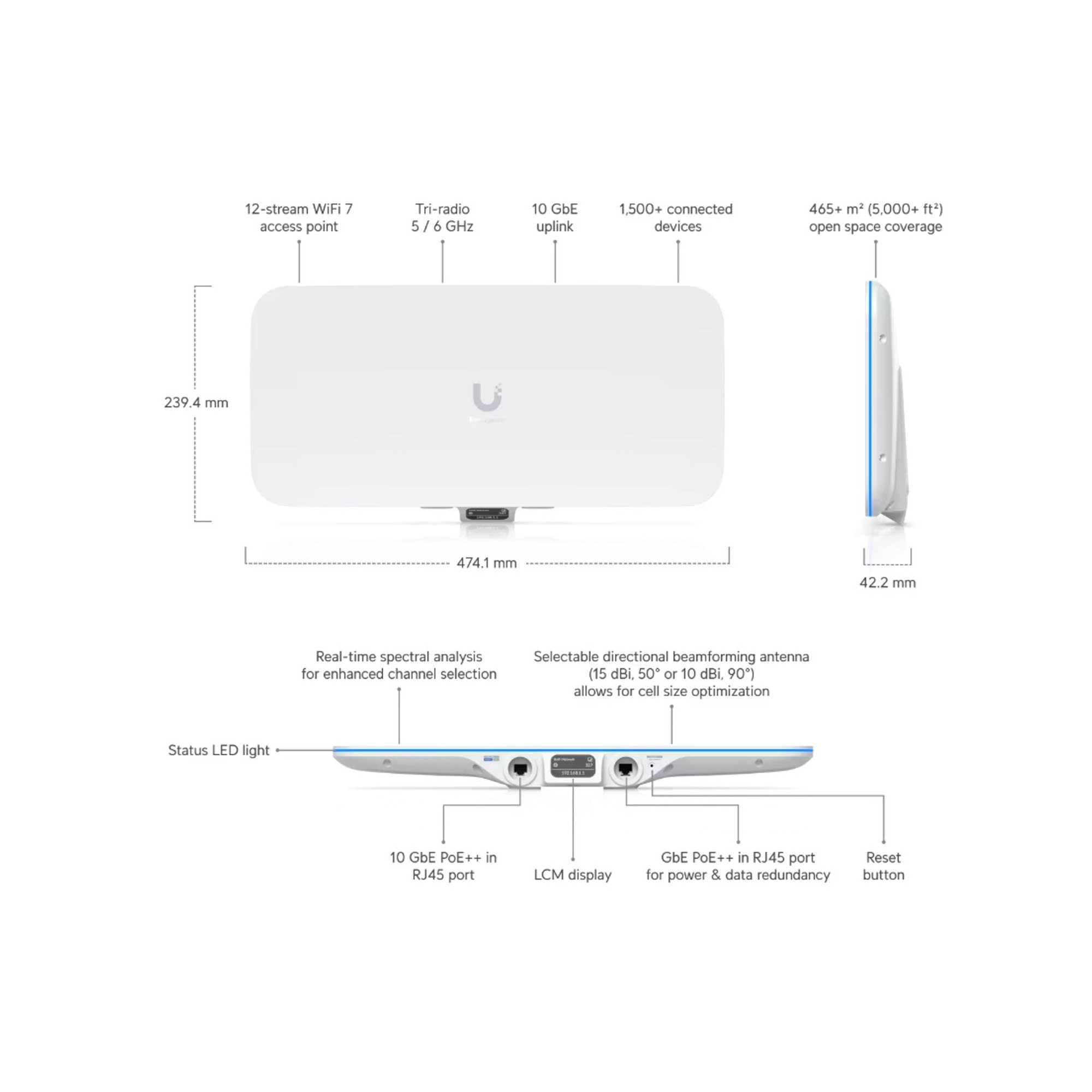 UniFi E7 Audience oferuje obszar pokrycia do 465 m² oraz obsługę ponad 1500 jednoczesnych klientów, co czyni go idealnym rozwiązaniem dla kampusów, hal, centrów konferencyjnych, obiektów użyteczności publicznej i dużych przestrzeni biurowych.