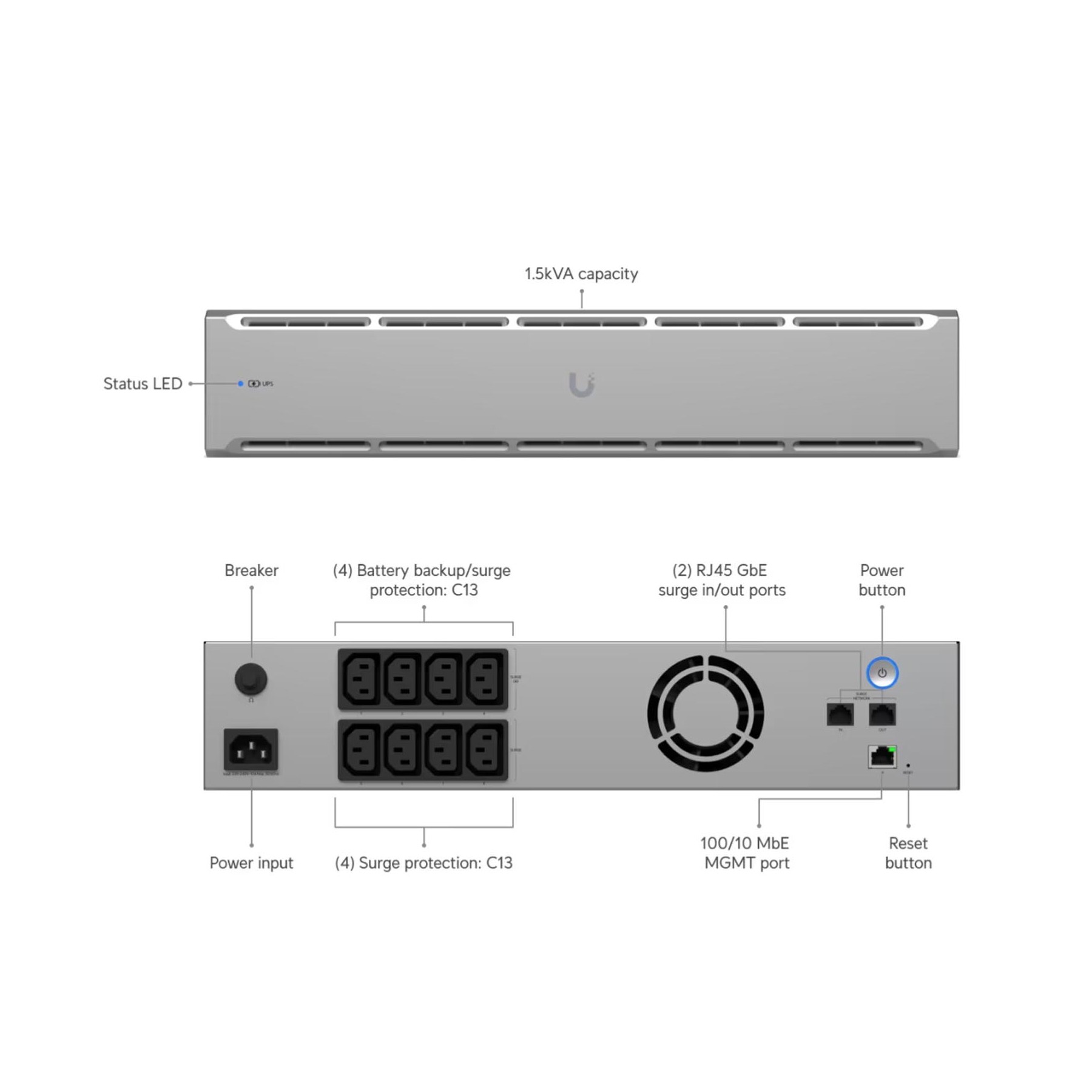 Ubiquiti UniFi UPS 2U (UPS-2U) to zarządzany przez UniFi zasilacz awaryjny o mocy 1,5 kVA do montażu w szafie rack z 4 gniazdami rezerwowymi, 4 gniazdami przeciwprzepięciowymi i wymienną baterią o pojemności 216 Wh, zapewniającą 8 minut pracy przy połowie obciążenia (500 W). Obsługuje funkcję łagodnego wyłączania dla urządzeń UNVR i UNAS oraz jest kompatybilny z NUT dla urządzeń innych producentów.