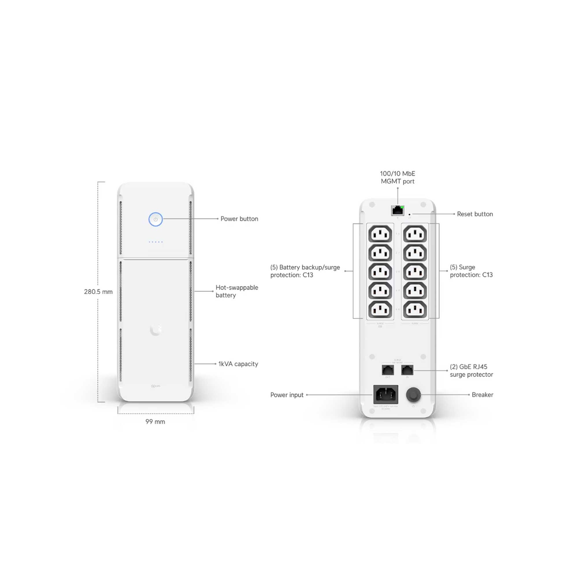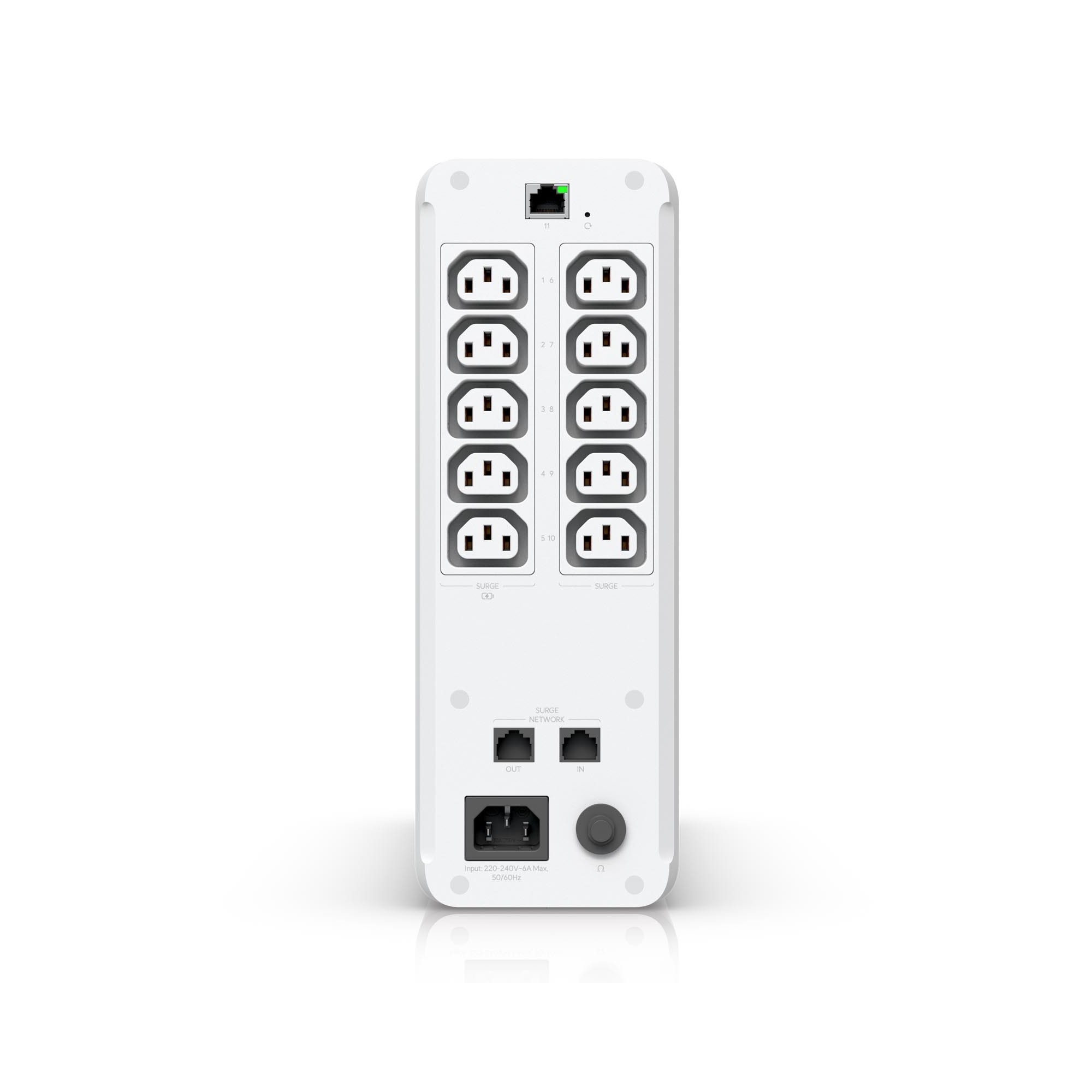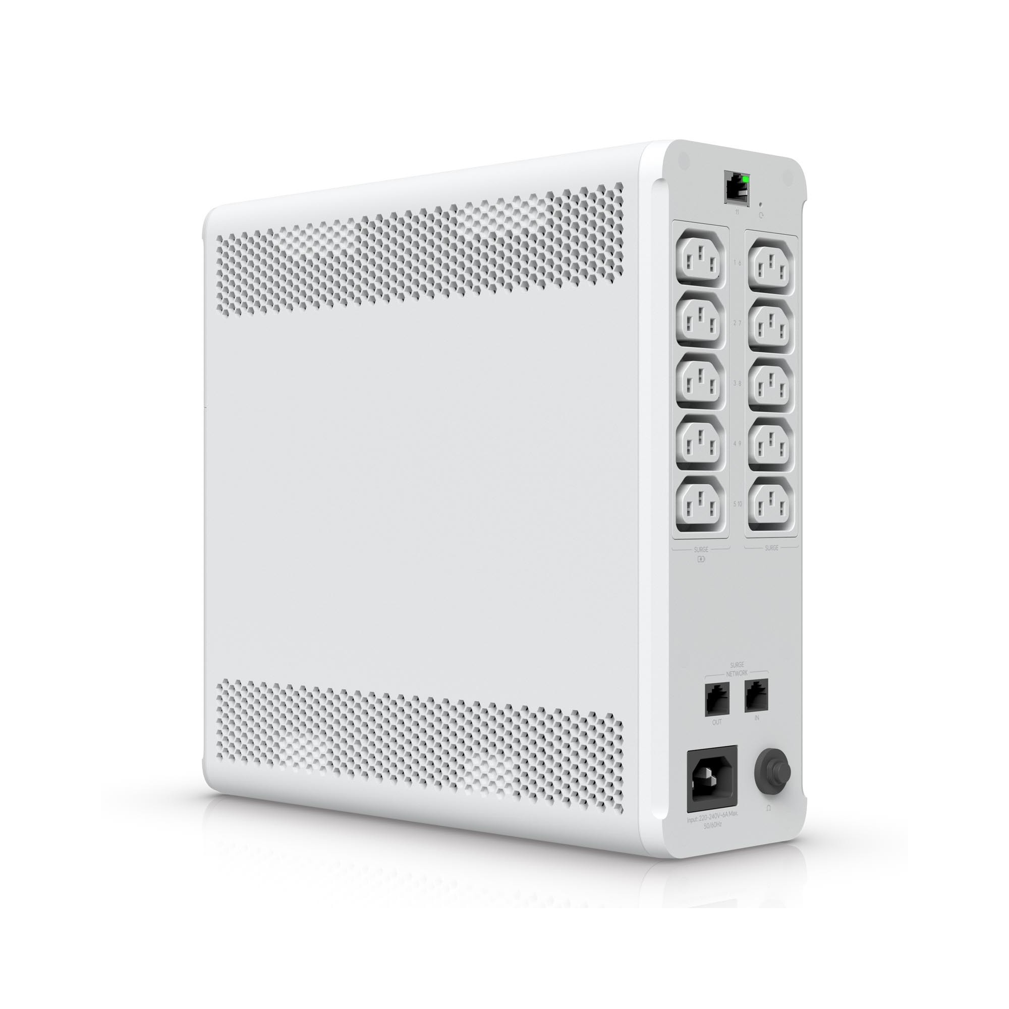 Ubiquiti UniFi UPS to zapasowy zasilacz przeznaczony do urządzeń sieciowych, zapewniający ich działanie podczas awarii zasilania. Urządzenie ma konstrukcję typu tower i zawiera 10 gniazdek zasilających. Spośród nich 5 gniazd (C13) zapewnia ochronę przed przepięciami, a kolejne 5 gniazd (C13) oferuje zarówno ochronę przeciwprzepięciową, jak i podtrzymanie bateryjne. Bateria typu hot-swap umożliwia wymianę bez wyłączania urządzenia.