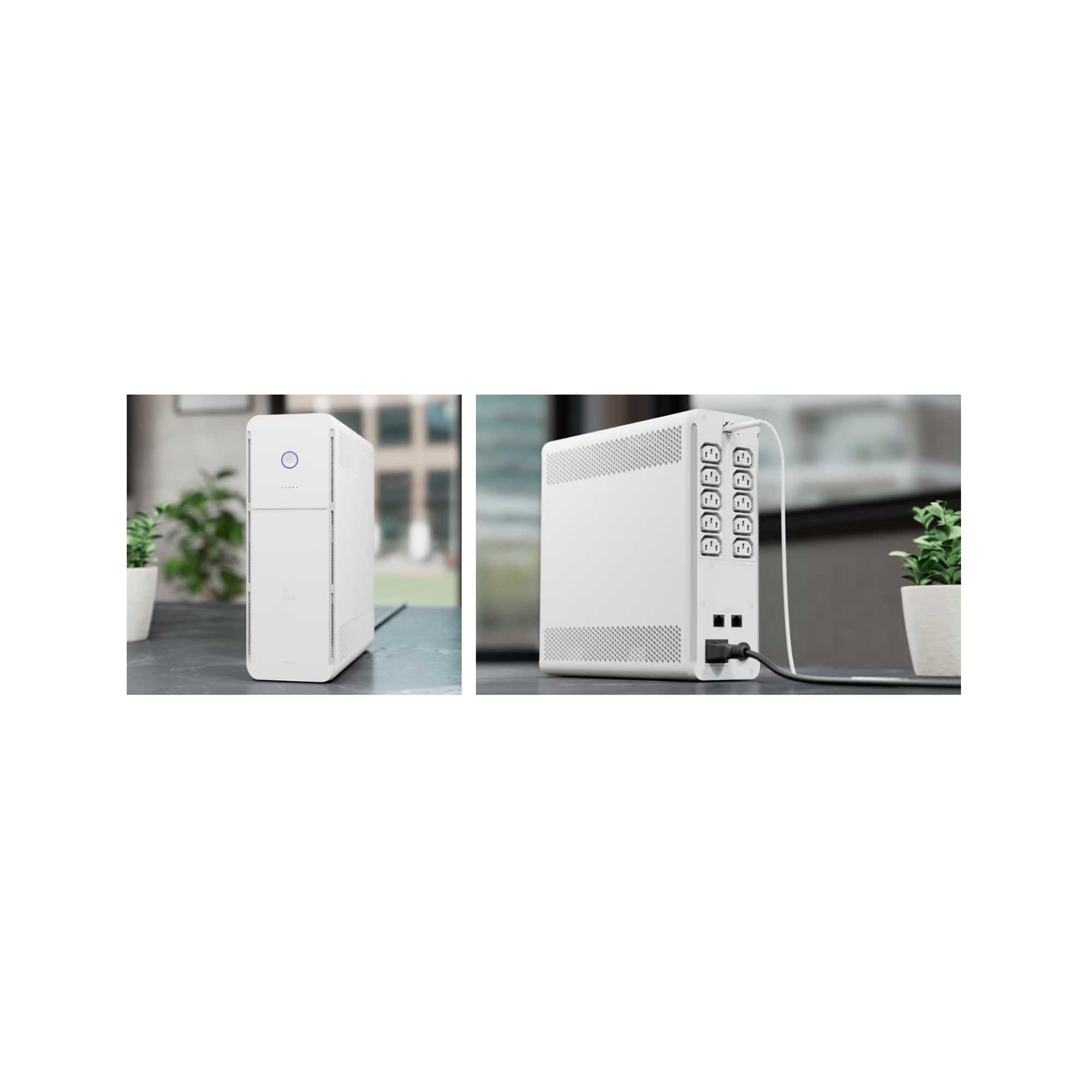 Ubiquiti UniFi UPS Tower (UPS-Tower) to zarządzany przez UniFi zasilacz awaryjny o mocy 1 kVA z 5 gniazdami zapasowymi, 5 gniazdami przeciwprzepięciowymi i baterią wymienną podczas pracy, 108 Wh, czas pracy przy połowie obciążenia (300 W) wynoszący 7 minut. Obsługuje funkcję łagodnego wyłączania dla UNVR i UNAS oraz zapewnia kompatybilność z NUT dla urządzeń innych producentów.