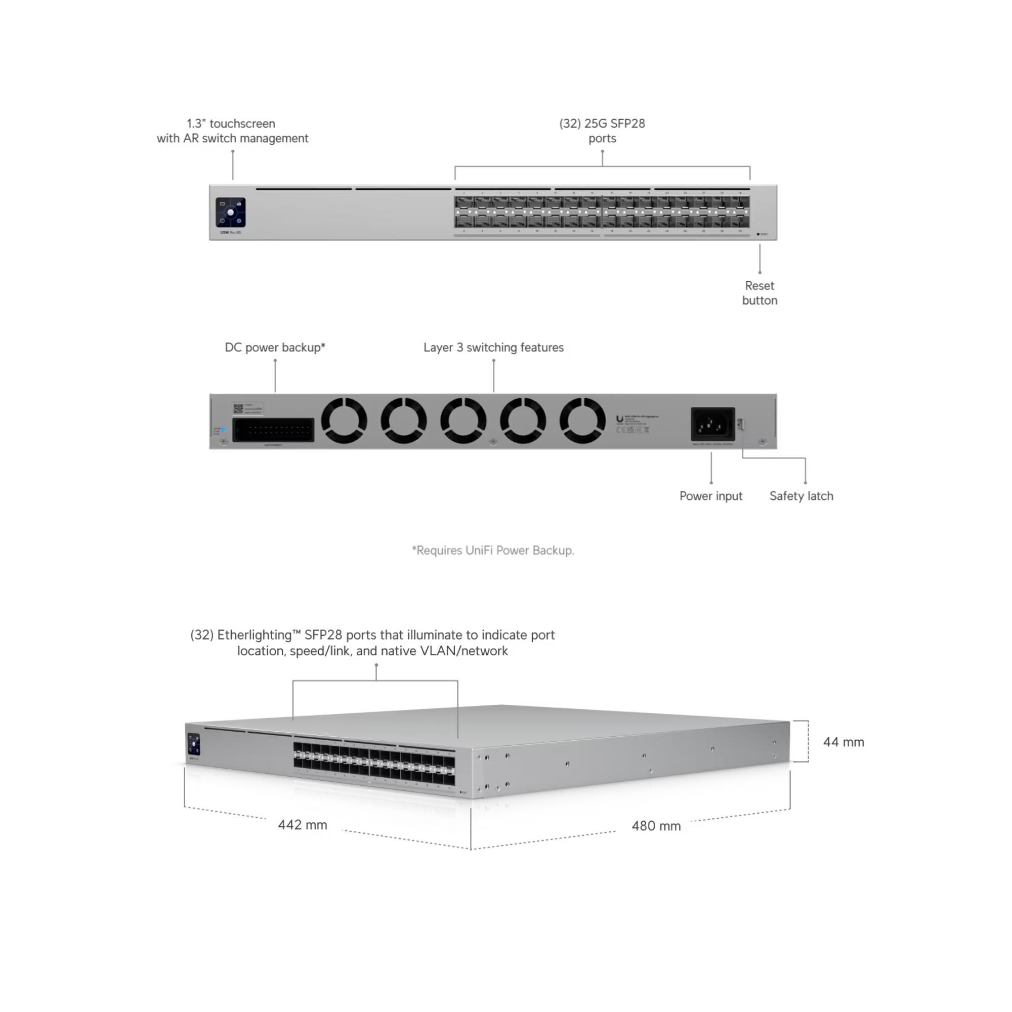 Ubiquiti USW-Pro-XG-Aggregation to w pełni zarządzalny przełącznik L3 w obudowie do montażu w szafie 19" wyposażony w 32x porty SFP28 (obsługujące 1/10/25 Gb/s) z funkcją Etherlighting, która umożliwia podświetlenie portów różnymi kolorami w celu wskazania lokalizacji portu, prędkości/stanu połączenia oraz natywnej sieci VLAN/sieci. Jest wyposażony w ekran dotykowy o przekątnej 1,3 cala, na którym można wyświetlać statystyki poszczególnych portów, stany błędów, obciążenie sieci i inne informacje. Urządzenie USW-Pro-XG-Aggregation jest zarządzane za pomocą kontrolera UniFi lub aplikacji mobilnej, co umożliwia łatwe tworzenie, skalowanie i monitorowanie sieci przedsiębiorstwa.